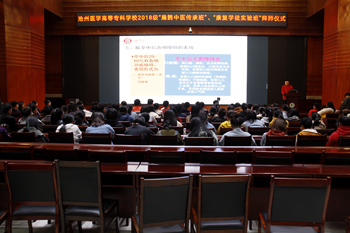 典礼由健康管理与服务系主任张秋雨主持。典礼上,教务处处长金玉忠宣读了《沧州医学高等专科学校关于成立2018级“扁鹊中医传承班”和“康复学徒实验班”的决定》。随后,学员代表向导师行拜师礼、敬茶,完成了拜师仪式。接下来,导师代表、河北省沧州中西医结合医院王利春,学员代表、中医学18-4班俱科研分别进行了发言。最后,“康复学徒实验班”导师王利勇作了题为“脑卒中早期康复”的精彩专题讲座,为“扁鹊中医传承班”和“康复学徒实验班”的同学们上了“开班第一课”。