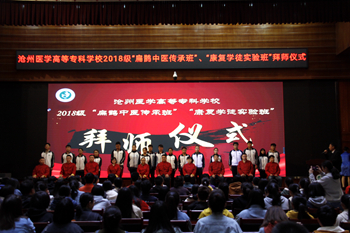 3月14日晚,我校第二学术报告厅举行了2018级“扁鹊中医传承班”、“康复学徒实验班”拜师仪式。参加拜师仪式的有我校教务处、医学系、健康管理与服务系副科级以上干部,沧州市人民医院、河北省沧州中西医结合医院专业导师和我校2018级康复治疗技术、针灸推拿、中医学专业学生代表。