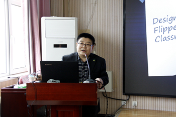 吴教授首先基于教学现实,提出“教师困于课堂,如何寻求破解之道”的问题,继而引出“翻转课堂”的理念,并直观地用金字塔学习模型对传统教学模式和翻转课堂教学模式进行了比较。同时,吴教授以“布鲁姆分类法”为依据,把教学过程与识记、理解、应用、分析、评估、创新相对应,把翻转课堂上学生在课前课中、课上课下、课内课外的学习任务加以明确,以期达到科学的学习效果。最后,吴教授现场演绎了《 21世纪实用英语综合教程》第二册Unit Two翻转课堂的教案设计,详细介绍了翻转课堂的流程:教学目标、对比分析、教学环节、前置学习、课堂学习等。吴教授的教案设计思路清晰、内容新颖,运用了微课、思维导图、角色扮演等多种教学手段。吴教授总结认为,翻转课堂是一种系统性教学设计,让师生双方均受益;教学设计是一种革新,要摒弃固定型思维,始终运用发展型思维来审视自己的教学。