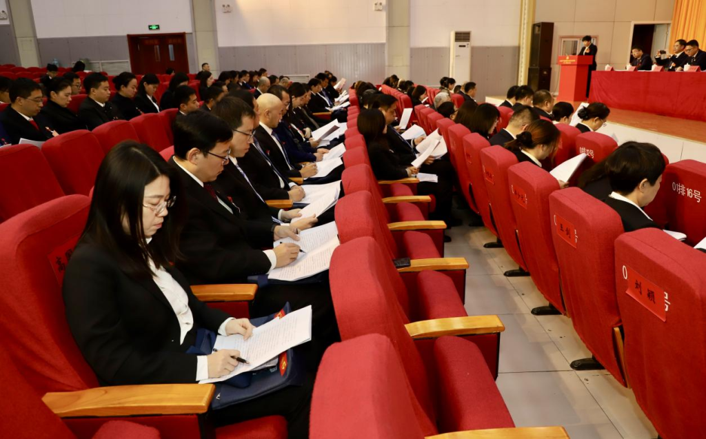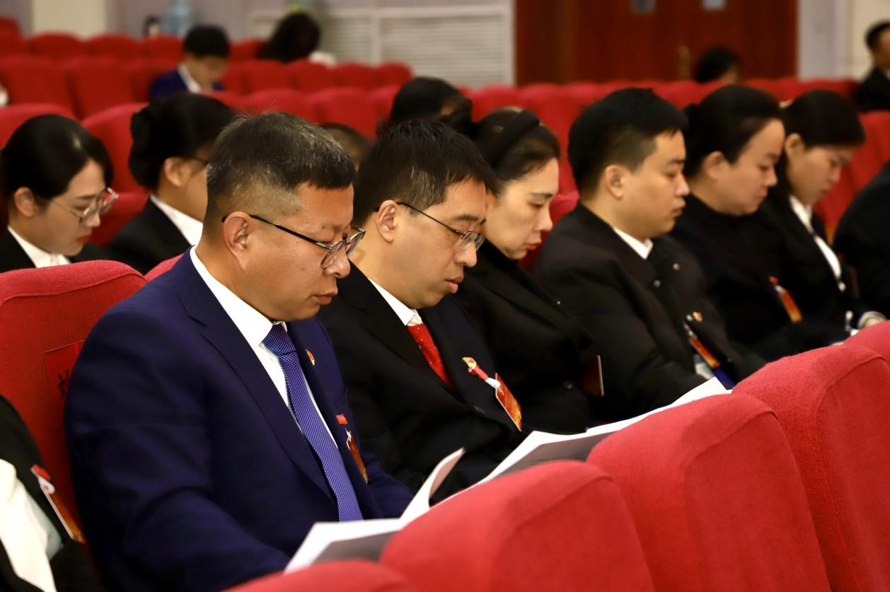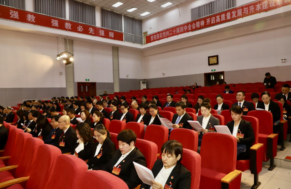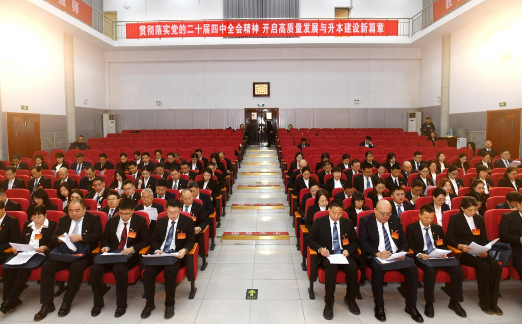 学校东报告厅内气氛庄严热烈。镰刀锤头组成的中国共产党党徽悬挂在主席台正中,熠熠生辉;十面鲜艳的红旗分列两侧,交相辉映。“贯彻落实党的二十届四中全会精神,开启高质量发展与升本建设新篇章”的条幅悬挂在二楼眺台上。