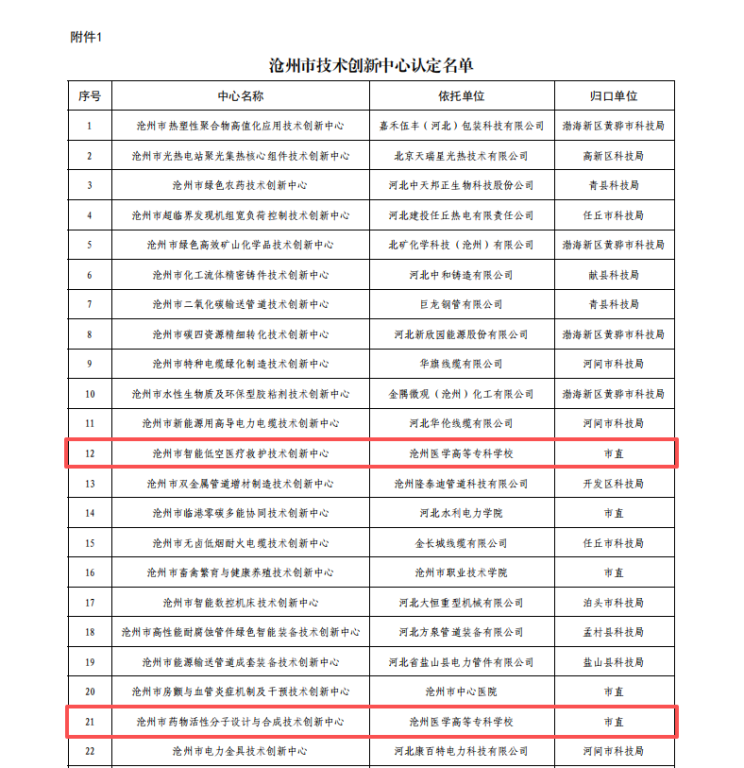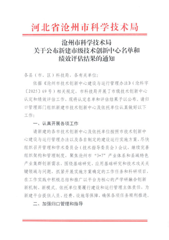 近日,沧州市科学技术局正式公布了2025年度新建市级技术创新中心名单及绩效评估结果。我校在此次评审中表现突出,共获批新建2个市级技术创新中心,另有4个现有中心顺利通过绩效评估,其中1个获评“优秀”等级。在全市众多高校、医院及企业依托单位中,交出了一份极具辨识度的成绩单,充分展现了我校在医学与健康领域的科研优势和平台建设能力。