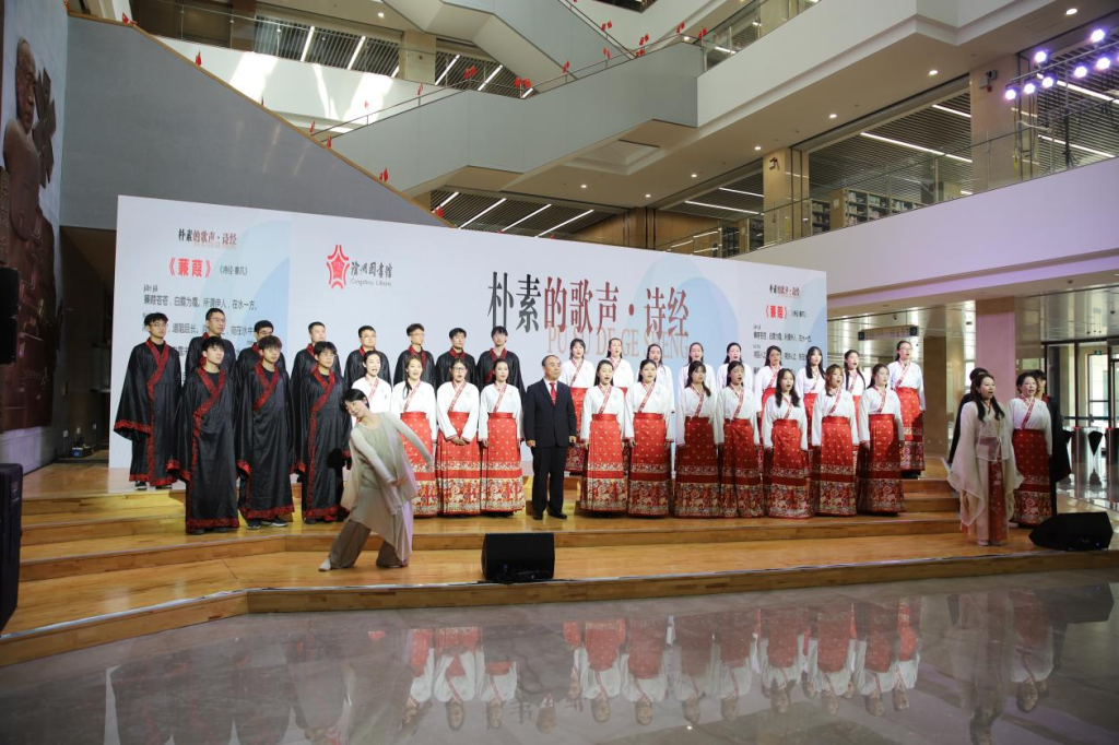 活动现场,沧州市图书馆馆员与沧医学子联袂演绎《朴素的歌声——诗经》经典诵读,以铿锵音韵再现千年经典魅力;河北省劳模、国家级非物质文化遗产省级传承人李雪倾情演唱《诗经里的村庄》,将《诗经》文化与故乡情怀融为一体,用歌声传递文化根脉与家国深情,赢得全场热烈掌声。